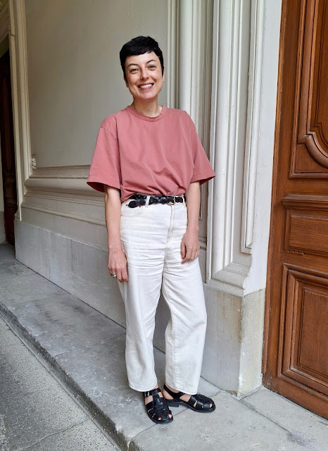 T-shirt Studio Nicholson, jeans Bellerose, ceinture Soeur, sandales Paraboot, veste Lemaire, portefeuille Mansur Gavriel, bague Quarry.