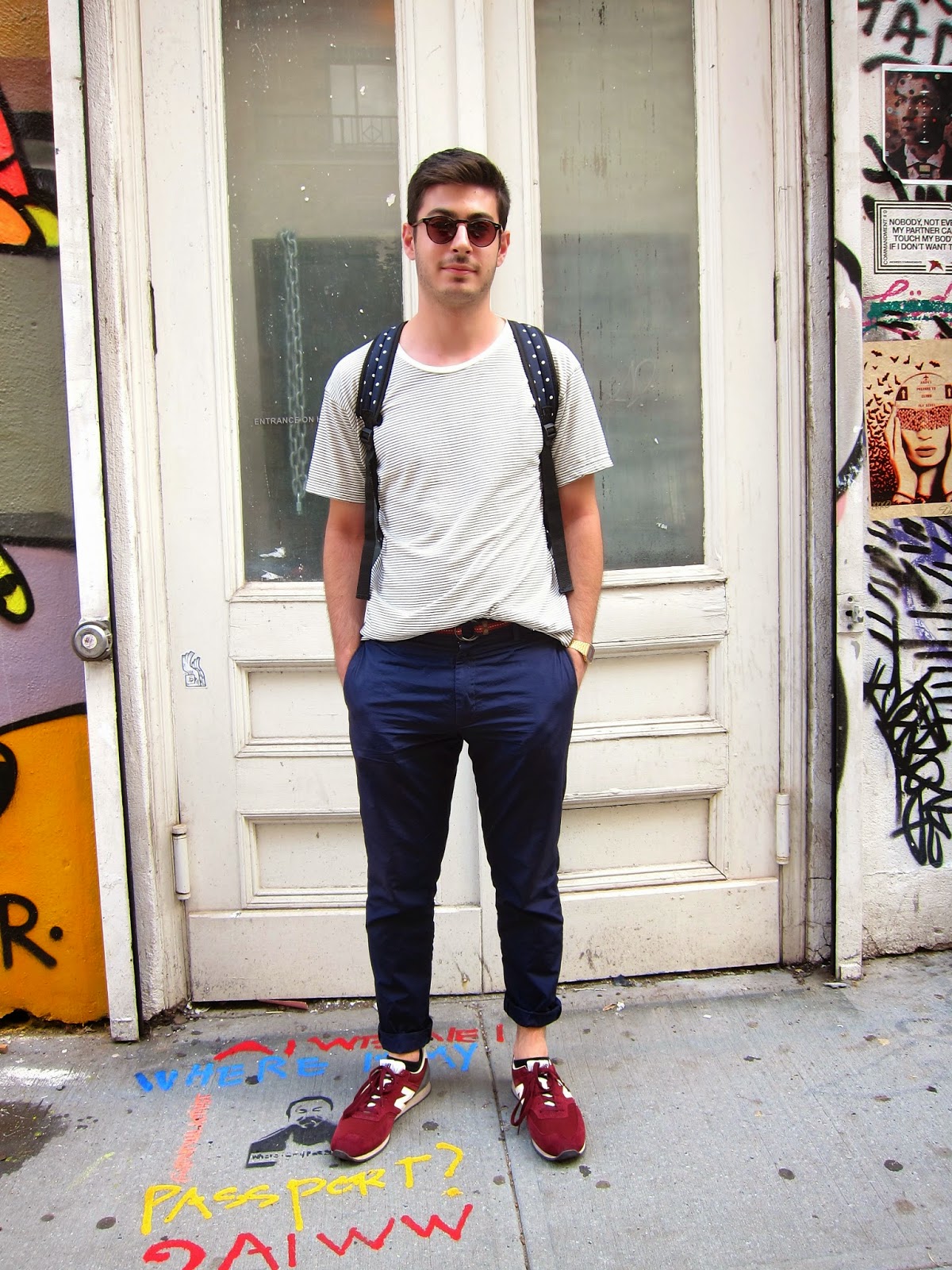 Kévin : t-shirt American Apparel, chino COS, baskets New Balance, sac à dos H&M.